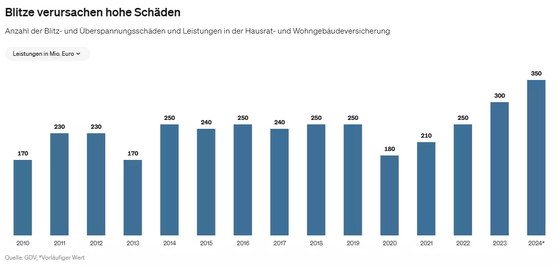 AUSWIRKUNGEN EINES BLITZEINSCHLAGES Zerstörung Spannungsdurchschlag von Halbleiterübergängen Zerstörung der Bonddrahtanschlüsse von Bauelementen Zerstörung von Leiterbahnen oder Anschlüssen von Leiterplatten Zerstörung von Triacs oder Thyristoren durch zu große dV/dt-Werte. Betriebsstörungen Undefinierter Betrieb von Logikgattern, Thyristoren und Triacs Löschen von Speicherinhalten Programmfehler- oder abstürze Daten- und Übertragungsfehler Vorzeitige Alterung Bauelemente, die Überspannungen ausgesetzt sind, haben eine kürzere Lebensdauer. (Schäden und Kosten durch Überspannungen) (Durch Überspannung verursachter Schaden)