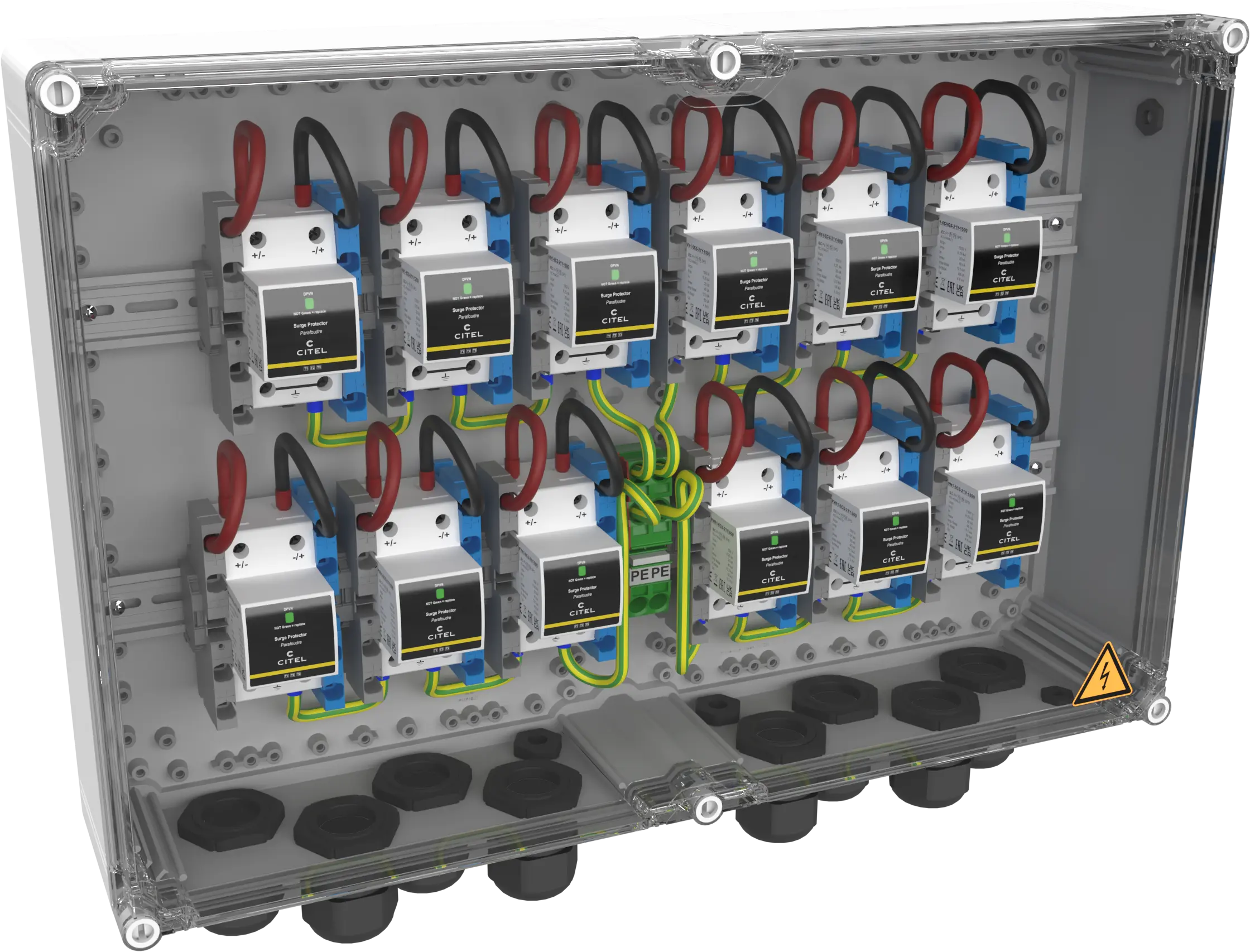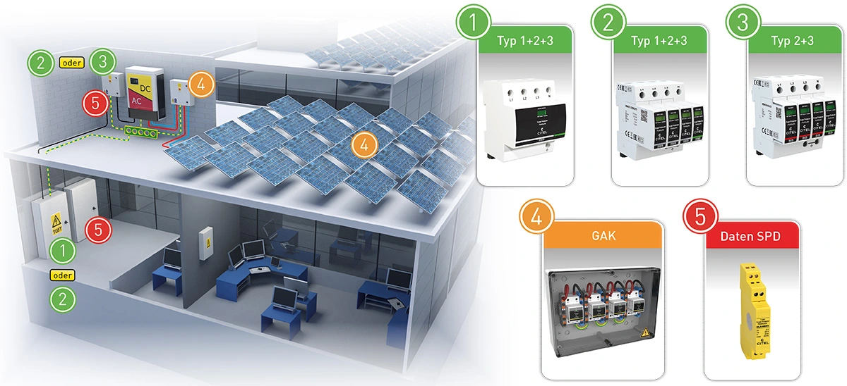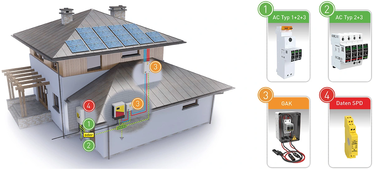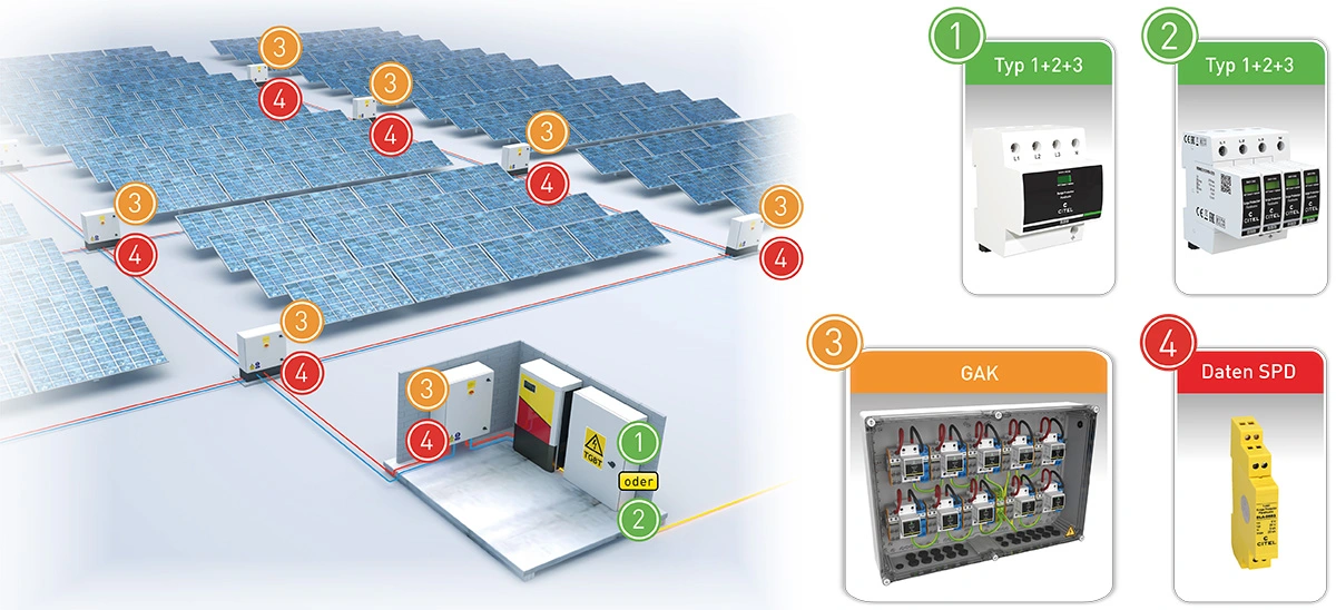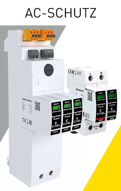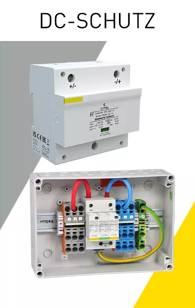 Überspannungsschutz für Photovoltaikanlagen INHALT 1. EIGENHEIME 2. GEWERBE UND INDUSTRIE 3. FREIFLÄCHEN 4. STAND DER TECHNIK 5. PRODUKTAUSWAHL 6. DOWNLOADS AUSWAHL UND PLATZIERUNG VON SPDs Eigenheime Komplettschutz für alle Bereiche In der Praxis wird unterschieden zwischen Häusern mit oder ohne äußerem Blitzschutz. Ist für ein Gebäude kein äußerer Blitzschutz gefordert, ist davon auszugehen, dass keine erhöhte Gefahr für einen direkten Blitzeinschlag besteht. Der Überspannungsschutz auf der DC-Seite der Photovoltaikanlage muss demnach nur gegen indirekt eingekoppelte Überspannungen realisiert werden. In diesem Fall ist ein SPD Typ 2 (DS50VGPVS) sowohl am PV-Generator als auch am Wechselrichter vorzusehen. Sind die Leitungslängen zwischen Generator und Wechselrichter vernachlässigbar (<10m), dann kann auf eines der beiden Überspannungsschutzgeräte verzichtet werden. Die Stringleitungen der Generatorverkabelung bilden u.U. eine große Induktionsschleife bei induktiv einkoppelnden Überspannungsereignissen wie z.B. Naheinschläge von Blitzen in einem Radius von etwa 2 km. Um hier eine erhöhte Sicherheit über die normativen Anforderungen hinaus zu erreichen, empfiehlt CITEL auch bei Gebäuden ohne äußeren Blitzschutz einen Kombiableiter Typ 1+2 (DS50VGPVS/12KT1) einzusetzen. Auf der AC-Seite bieten Kombiableiter Typ 1+2+3 (ZPAC oder DAC1-13VGS) im Zählerschrank den optimalen Schutz. Dieser schützt den AC-Eingang des Wechselrichters und die Elektroinstallation des Gebäudes gleichermaßen. Für Häuser mit äußerem Blitzschutz, der in der Regel nicht vorgeschrieben ist, gelten weitergehende Bestimmungen, über die wir Sie bei Bedarf gerne eingehend informieren. Installationsort Produktbezeichnung Beschreibung Produktbild Niederspannungshauptverteilung ZPAC1-13VG-PRO-SU Kombi-Ableiter Typ 1+2+3 in VG-Technology für 40mm Sammelschiene, 10 Jahre Garantie, Ableitfähigkeit pro Pol: Iimp= 8 kA (10/350 μs), Betriebs- und Leckstromfrei, Erfüllt die Normen IEC 61643‑11 und EN 61643‑11, VDE-AR-N 4100 konform, Integrierte Sicherung, Zweifacher Spannungsabgriff für RFZ und APZ, Potentialfreier Fernmeldekontakt Niederspannungshauptverteilung DAC1-13VGS-31-275 Kombi-Ableiter Typ 1+2+3 in VG-Technology für Hutschiene, 10 Jahre Garantie, Ableitfähigkeit pro Pol: Iimp= 12,5 kA (10/350 μs), Betriebs- und Leckstromfrei, Erfüllt die Normen IEC 61643‑11 und EN 61643‑11, VDE-AR-N 4100 konform Am Gebäudeeintritt /Vor dem Wechselrichter CiPlug1-DP6VG-1-XS Generatoranschlußkasten für 1 MPP-Tracker / 1 String, Typ 1+2+3 Überspannungsschutz integriert (DPVN1-6CVG-21Y-1200), Schutzart IP65, Anschluss über MC4-Stecker Multimediafeld DLA-12D3 Überspannungsschutz D1, C2 für MSR, Telekommunikations- und Datentechnikanwendungen, Geschützter Schirmanschluss Betriebsstrom bis 300 mA, Erdung über Hutschiene oder Fahrstuhlklemme bzw. Federkraftklemme, Nur 13 mm breit, Steckbares Schutzmodul, Erfüllt die Normen IEC 61643‑21 und VDE 0845‑3‑1 Zurück zum Anfang der Seite Gewerbe und Industrie Vollständiges Schutzkonzept Da es sich bei Gewerbe- und Industriegebäuden meist um Immobilien mit hohen Sachwerten und bei öffentlichen Institutionen um Gebäude mit sensiblen Informations- und Datenmaterial handelt, ist hier der vollständige Schutz besonders wichtig. Ein Kombi-Ableiter Typ 1+2+3, wie der DACN1-25CVGS oder der DAC1-13VGS garantiert hier bestmöglichen Schutz der AC-Seite durch einen niedrigen Schutzpegel < 1500V, kombiniert mit einem Gesamt-Blitzstromableitvermögen von 100 kA (25kA/Pol). Installationsort Produktbezeichnung Beschreibung Produktbild Niederspannungshauptverteilung DACN1-25CVGS-31-275 Kombi-Ableiter Typ 1+2+3 auf Basis einer Gasgefüllten Funkenstrecke, 10 Jahre Garantie, Ableitfähigkeit pro Pol: In= 25 kA (8/20 μs); Iimp= 25 kA (10/350 μs), Sichere Trennvorrichtung, Fernsignalisierung serienmäßig, Optimiert für TOV, Erfüllt die Normen IEC 61643‑11 und EN 61643‑11 Niederspannungshauptverteilungoder Unterverteilung DAC1-13VGS-31-275 Kombi-Ableiter Typ 1+2+3 in VG-Technology für Hutschiene, 10 Jahre Garantie, Ableitfähigkeit pro Pol: Iimp= 12,5 kA (10/350 μs), Betriebs- und Leckstromfrei, Erfüllt die Normen IEC 61643‑11 und EN 61643‑11, VDE-AR-N 4100 konform In der Unterverteilung DAC50VGS-31-275 Generatoranschlußkasten für 1 MPP-Tracker / 1 String, Typ 1+2+3 Überspannungsschutz integriert (DPVN1-6CVG-21Y-1200), Schutzart IP65, Anschluss über MC4-Stecker In den Modulfeldern /Vor dem Wechselrichter GAK4.K2x10.K1x10.DP6VG-1-XS Generatoranschlußkasten für 4 MPP-Tracker / 2 Strings, Überspannungsschutz integriert (Typ 1+2+3 - 4x DPVN1-6CVG-21Y-1200), Schutzart IP65, Anschluß über Federkraftklemmen Multimediafeld DLA-12D3 Überspannungsschutz D1, C2 für MSR, Telekommunikations- und Datentechnikanwendungen, Geschützter Schirmanschluss Betriebsstrom bis 300 mA, Erdung über Hutschiene oder Fahrstuhlklemme bzw. Federkraftklemme, Nur 13 mm breit, Steckbares Schutzmodul, Erfüllt die Normen IEC 61643‑21 und VDE 0845‑3‑1 Zurück zum Anfang der Seite Freiflächenanlagen Effizienter Schutz PV-Kraftwerke werden heutzutage mit immer mehr Technik bestückt. Hierzu zählen neben Monitoringsystemen zur reinen Leistungsüberwachung vor allem auch immer mehr Sensorik zur Erfassung und Auswertung der Umgebungsbedingungen wie u.a. Umgebungstemperatur, Modultemperatur, Einstrahlung und Windgeschwindigkeit. Auch die Ströme der einzelnen Strings werden häufig genau erfasst. Darüber hinaus werden teilweise auch Tracking-Systeme zur automatischen Nachführung der Module nach dem Sonnenstand eingesetzt. Der Schutz all dieser Systeme ist hier besonders wichtig. Bei der Erstellung des Schutzkonzepts sollten daher diese Daten- und Steuerleitungen konsequent mit einbezogen werden. Freiflächenanlagen haben eine größere räumliche Ausdehnung und damit eine höhere Blitzgefährdung bei Gewittern als kompakte Anlagen auf dem Dach. Diesem Umstand