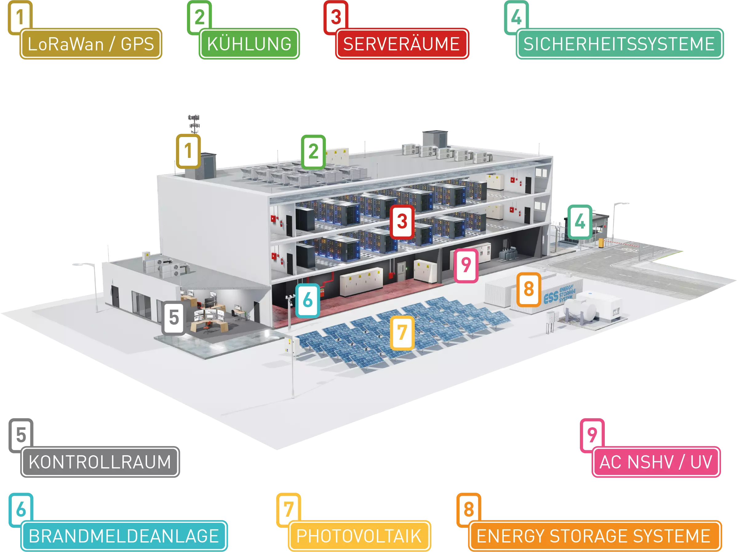 Schutz für Ihr Rechenzentrum Angesichts der Vielfalt und Empfindlichkeit der Geräte ist der Schutz eines Rechenzentrums zwingend notwendig. Rechenzentren bilden das Rückgrat in der heutigen digital geprägten Welt für unzählige Branchen - vom Finanzwesen bis zum Gesundheitswesen, vom E-Commerce bis zur Unterhaltung. Ein zuverlässiger und unterbrechungsfreier Betrieb ist Voraussetzung für den reibungslosen Daten- und Servicefluss, auf den Unternehmen und Privatpersonen täglich angewiesen sind. CITEL bietet eine umfassende Auswahl an Überspannungsschutzgeräten (SPDs) nach internationalen Standards und bietet so eine umfassende Schutzlösung gegen Überspannungen für Rechenzentren. Unser Sortiment umfasst Hochleistungs-SPDs für die Spannungsversorgung, spezielle SPDs für Schaltanlagen, Frequenzumrichter, Solaranlagen, Energy Storage Systeme (ESS), Datenleitungen und Hochfrequenztechnik. CITEL hat den passenden Schutz, egal, welches System in einem Rechenzentrum geschützt werden muss! Produktauswahl Installationsort Produktbezeichnung(beispielhaft) Beschreibung Produktbild AC NSHV / UV DACN1-25CVGS-31-275 AC Kombi-Ableiter Typ 1+2+3 für 230 V Netze SICHERHEITSSYSTEME LAN-10G-POE-CR Überspannungsableiter D1, C2 für 10GB PoE++ Cat6A Ethernet Anwendungen ENERGY STORAGE SYSTEME DDC50S-21Y-1200 DC Überspannungsableiter Typ 2, entwickelt für den Schutz von Energy Storage Systemen PHOTOVOLTAIK DPVN1-6CVGS-21Y-1200 Kombi-Ableiter Typ 1+2+3 für Photovoltaikanlagen bis 1200 VDC (Ucpv) BRANDMELDEANLAGEN DACN10S-21YG-275 Überspannungsableiter Typ 2 und 3 zum Schutz der 230 VAC Spannungsversorgung der BMZ KONTROLLRAUM MJ8-POE-C6A Überspannungsableiter D1, C2 für 10GB Cat6A Ethernet Anwendungen SERVERRÄUME MJ8-POE-C6A Überspannungsableiter D1, C2 für 10GB Cat6A Ethernet Anwendungen KÜHLUNG DAC1-13VGS-31-275 AC Kombi-Ableiter Typ 1+2+3 für 230 VAC Netze LoRaWan / GPS P8AX25-N/FF Überspannungsschutz für den Einsatz in Mobilfunk, LoRaWan oder Satellitenkommunikation SPD for Datacenter